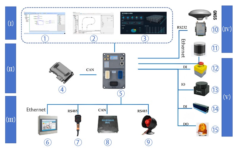 7. Communication & Interfaces: The system supports standard industrial protocols including Ethernet, RS232, RS485, and CAN bus for versatile connectivity with drivers, sensors, and safety components.