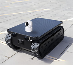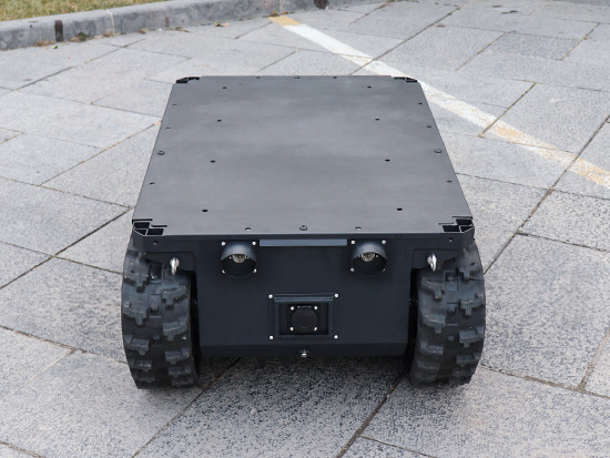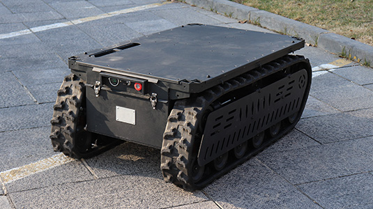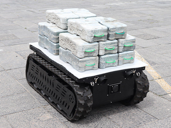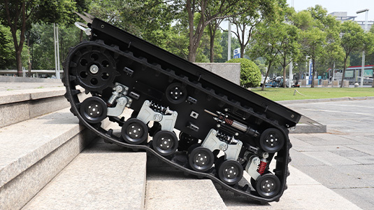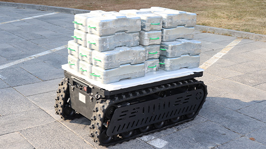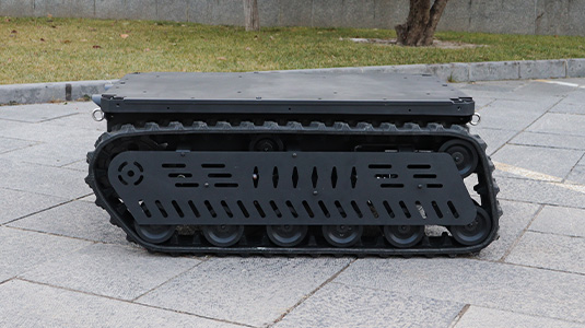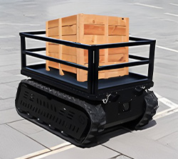 1.Structural performance: 1) The overall track structure of the chassis is designed in a parallelogram shape, with high ground clearance, strong crossing ability, long track grounding area, excellent stair climbing ability, and strong outdoor off-road ability. Both the front and rear tracks can wrap the vehicle body, which is more conducive to protecting the vehicle from damage and allowing it to walk on various terrains. 2) Top 1150 * 750mm large flat plate, can be equipped with guardrails and used as a transportation vehicle. 2. Protection level: IP65. 3. Communication protocol: 485 communication, CAN protocol. 4. Working mode: DC brushless Hall motor or servo motor drive+encoder, closed-loop control system, precise control. Precise control of steering angle, speed, and stroke. It can rotate in place or spiral as needed. 5. Driver: overvoltage, overcurrent, undervoltage, overheating, short circuit protection. 6. Control methods: joystick control, standard aircraft model remote control, and upper computer command control. Speed loop+displacement loop+differential loop, precise speed regulation. 7. Rubber tracks: good ground adhesion, long track grounding area. 8. Tensioning wheel: adjustable to ensure normal tensioning and operation of the track. 9. Widely applied in fields such as safety protection monitoring, robotic arm carriers, lifting platforms, transportation vehicle, etc. 10. Lithium iron phosphate battery: It has the advantages of high working voltage, high energy density, long cycle life, good safety performance, low self discharge rate, and no memory effect. 11. Shock absorption system: Christie and Matilda suspension combined with Christie shock absorption, providing excellent shock absorption system. 12. Switching control of high and low beams allows for night driving operations. 13. Support customization and secondary development. 14. Maximum 30km/h high speed customizable. With 2-10 km/h low speed, it will be stopped by the self-locking resistance of the worm gear reducer. With 10-20km/h medium speed , it’s automatically locked by the internal contracting brake. With 20-30km/h high speed, it has both internal contracting brake and electromagnetic brake. High, medium and low three-speed precise control on remote controller for speed ≥10km/h.
