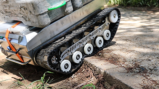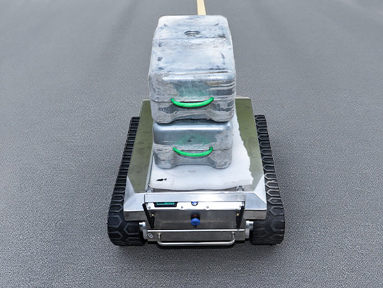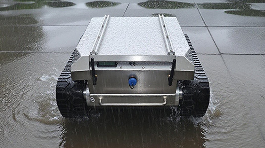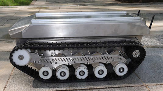 Features: 1. (1) The chassis is made of stainless steel material, which has good anti-corrosion and waterproof functions, strong crossing ability, long track grounding area, and strong outdoor off-road ability. The tracks can wrap the vehicle body in front and behind, which is more conducive to protecting the vehicle from damage and can walk on various terrains. (2) 500 * 350mm large tablet design, can be equipped with guide rails for easy installation of other components. 2. Protection level: IP65. 3. Communication protocol: RS232, CAN. 4. Working modes: servo motor drive + encoder, closed-loop control system, accurate control. Precise control of Angle, speed and stroke. The movement trajectory is arbitrary, can rotate in situ, can also spiral motion. 5. Driver: over voltage, over current, under voltage, overheating, short circuit protection. 6. Control modes: joystick control, standard aircraft model remote control, and upper computer command control. Speed loop+displacement loop+differential loop, precise speed regulation. 7. Guide wheel: can be tensioned and adjusted to ensure the normal tension and operation of the track. 8. Suspension system: multi-level Christie damping structure, up and down damping, center of gravity damping. 9. The chassis is equipped with headlamps, which can be used for night driving operations. 10. Support customization and secondary development.