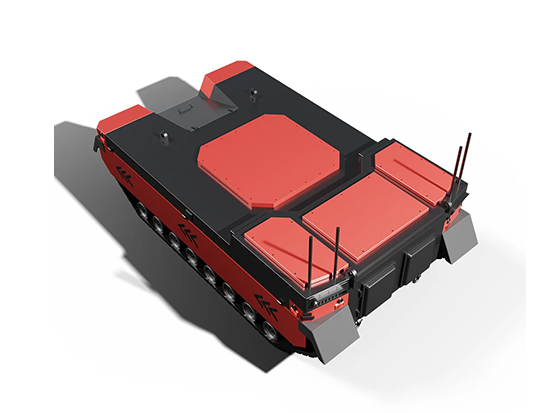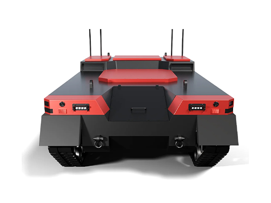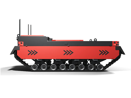 1. Structural performance: The overall track structure of the chassis is designed in a parallelogram shape, with high ground clearance, strong crossing ability, long track grounding area, excellent stair climbing ability, and strong outdoor off-road ability. Both the front and rear tracks can wrap the vehicle body, which is more conducive to protecting the vehicle from damage and allowing it to walk on various terrains. 2. Protection level: IP65. 3. Communication protocol: 485 communication, CAN protocol. Support customization and secondary development. 4. Rubber tracks: good ground adhesion, long track grounding area. 5. Tensioning wheel: adjustable to ensure normal tensioning and operation of the track. 6. Driver: overvoltage, overcurrent, undervoltage, overheating, short circuit protection. 7. Shock absorption system: Christie and Matilda composite shock design maximizes the shock absorption height, increases the overload multiple of the entire vehicle, adapts to high-speed operation, and reaches a maximum speed of 40 km/h. 8. Omnidirectional antenna for orientation 9. The drive wheel is equipped with disc brakes and an ABS anti-lock braking device. 10. Use Parallel shaft gear reducer instead of worm gear reducer: 95% high transmission efficiency, high transmission accuracy, high torque density and load capacity, longevity and low wear rate, excellent heat dissipation performance, low operating noise. 11. Switching control of high and low beams allows for night driving operations. 12. Lithium iron phosphate battery: It has the advantages of high working voltage, high energy density, long cycle life, good safety performance, low self discharge rate, and no memory effect. 13. Two power supply methods for option:100% electric power Power: E-POWER is a power system consisting of intelligent power generation system, electric motor, inverter, and lithium battery. The front-end diesel engine or gasoline engine generates electricity, while the back-end is 100% pure electric drive, retaining the advantages of pure electric drive while extending the continuous working time of the chassis, fully realizing the electric drive technology without charging. 14. 20/40km/h high speed, with both internal contracting brake and electromagnetic brake. 15. High, medium and low three-speed precise control on remote controller. 16. Autonomous driving and navigation modules are reserved around the vehicle body, which is specifically designed for beyond-visual-range autonomous driving.